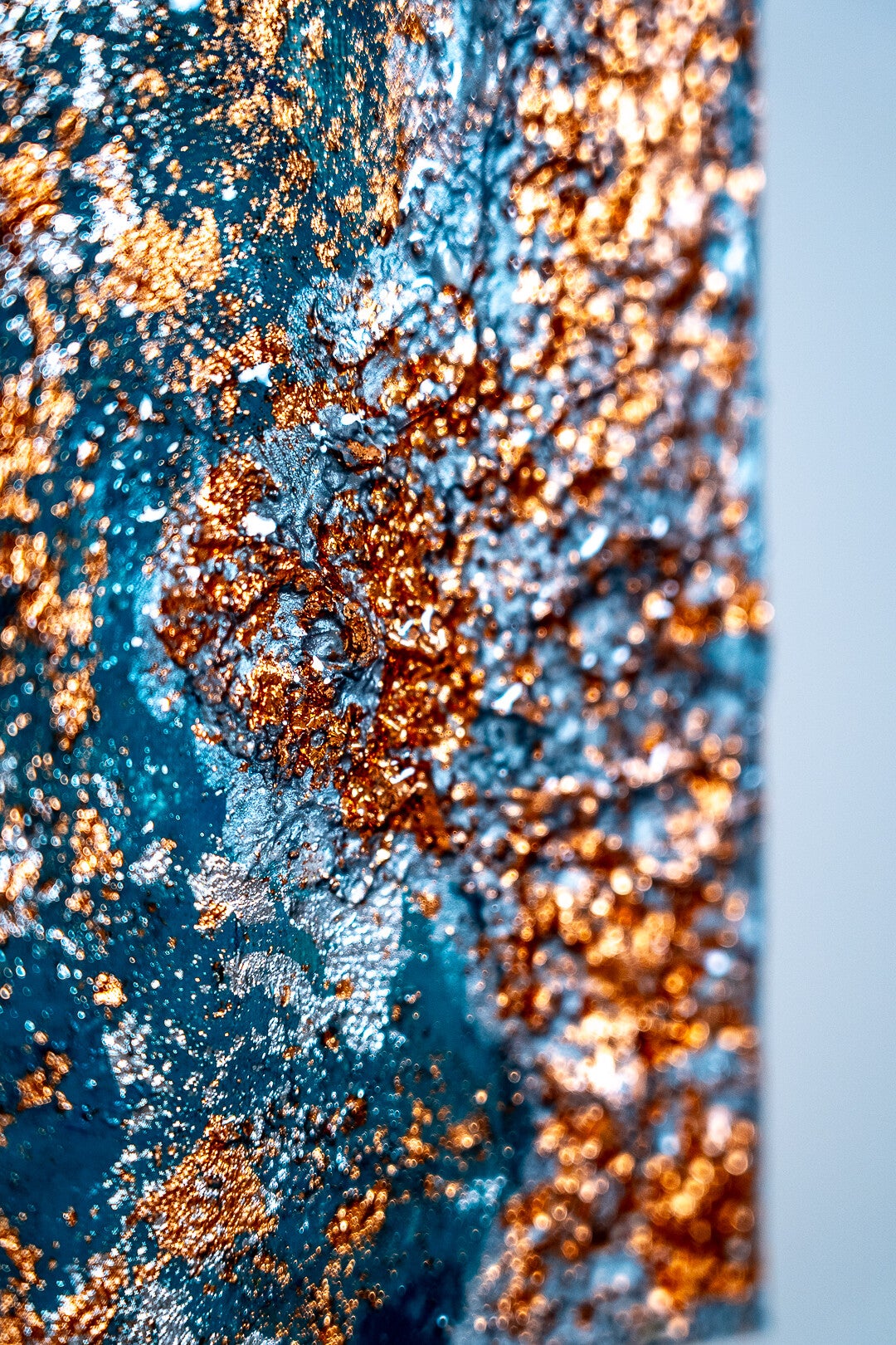 Nomi di questo dipinto Profondità Marine. Evoca un’atmosfera sottomarina. Caratteristiche: che rendono questo dipinto unico, sia a livello tecnico che a livello simbolico. Tecnica e Materiali Il dipinto mostra un uso combinato di due materiali distinti, che creano un forte contrasto visivo e tattile: Pittura a spessore: Le aree scure e turchesi sembrano realizzate con una tecnica a spatola o con pennellate molto cariche, che creano una superficie ruvida e materica, frammenti di foglia d'oro applicati sulla superficie. Questo conferisce al dipinto una lucentezza e una preziosità particolari. L'applicazione di questa tecnica in modo non uniforme suggerisce un'intenzione di dare di passaggio del tempo. Colori e Simbolismo Il dipinto gioca sull'accostamento di due colori principali, il turchese e l'oro, che hanno un forte impatto visivo e simbolico: Il Turchese: Spesso associato all'acqua, al mare e al cielo. Simboleggia la calma, la spiritualità, la guarigione e la protezione. In questo contesto, il turchese materico e irregolare può evocare l'idea di un fondale marino o di un'antica superficie corrotta dal tempo. L'Oro: Da sempre simbolo di ricchezza, luce, divinità e immortalità. Nell'arte, specialmente quella medievale e bizantina, l'oro veniva usato per rappresentare il sacro e la luce divina. Qui, i frammenti d'oro sparsi possono essere visti come bagliori di luce, tesori nascosti o frammenti di qualcosa di prezioso e eterno che resiste alla corrosione del tempo. L'interazione tra questi due colori crea una tensione visiva tra la serenità del turchese e la ricchezza dell'oro. Anno: 2025 Misure: 40x50 L’opera: Unica.